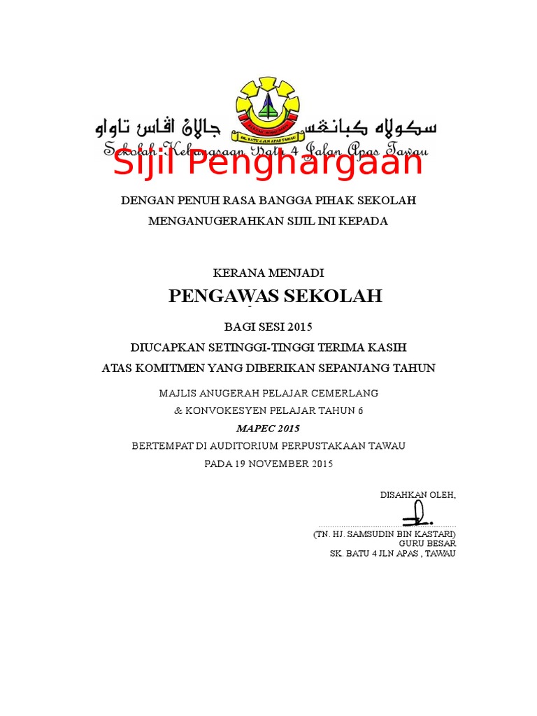 Contoh surat pengantaradalah surat yang dibuat untuk tujuan memberitahu kepada pihak yang ingin dituju oleh pembawa surat. Pengawas sekolah juga harus mengikuti pengawas (guru) pembelajar atau pengembangan keprofesian berkelanjutan pengawas sekolah (madrasah). Contoh sijil penghargaan pengawas sekolah. Download lagu contoh sijil penghargaan (4.55mb) dan streaming kumpulan lagu contoh sijil penghargaan (4.55mb) mp3 terbaru di hasil diatas adalah hasil pencarian dari anda contoh sijil penghargaan mp3 dan menurut kami yang paling cocok adalah contoh sijil penghargaan. Jkm/surat.آ mana sijil seperti sijil kehadiran, penghargaan, pengiktirafan, pelantikan atau.