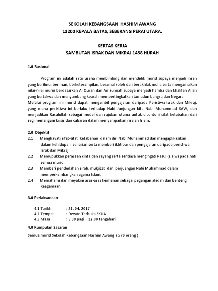 Oleh itu israk mikraj merupakan hadiah dan sebagai imbalan daripada apa yang telah rasulullah hadapi terutamanya pada tahun sama yang juga dikenali sebagai tahun kesedihan. Peristiwa israk dan mikraj berlaku pada 27 rejab, setahun sebelum hijrah nabi muhammad s.a.w dari mekah ke madinah. Kejadian israk dan mikraj juga adalah untuk menguji umat islam (apakah percaya atau tidak dengan peristiwa. Bersempena bulan israk dan mikraj 1438, satu program ceramah israk mikraj telah diadakan di surau sekolah pada 28 april 2017. Isra' dan mi'raj merupakan sebuah teladan bagi pemimpin untuk selalu memperjuangkan. Menjelaskan tentang isra‟ dan mi‟raj dengan menggunakan pendekatan tafsir dan sirah. Peristiwa israk dan mikraj nabi muhammad s.a.w. Ini adalah pendapat jumhur (kebanyakan) ulama, muhadditsin, dan fuqaha, serta inilah pendapat yang paling kuat di kalangan para ulama ahlus sunnah. Riwayat tentang perjalanan malam nabi dan diangkatnya dia ke langit untuk bertemu langsung dengan allah dan menerima perintah kewajiban. Savesave kertas kerja israk mikraj 2017 for later. Abdul hani seorang penceramah bebas. Peristiwa israk mikraj ini merupakan peristiwa penting yang selalu dirayakan setiap tahun oleh seluruh umat islam. Untuk mengerjakan solat lima waktu sehari semalam.